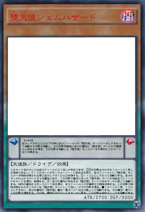 | 【D条件】 自分LPが5000以下の時に自分フィールドの「堕天使」モンスターがLPを払って発動する効果を発動し、その効果処理後に自分の墓地に「堕天使」カードが3種類以上存在する場合、その効果を発動した「堕天使」モンスターをD素材にこのカードをD召喚する。 | |||