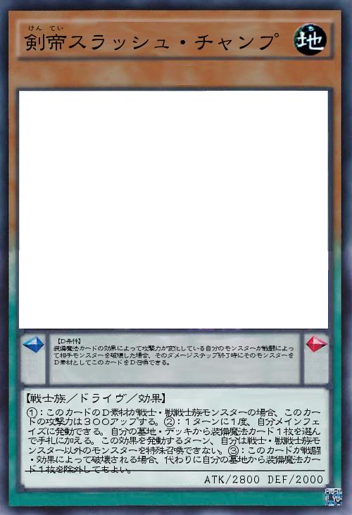 | 【D条件】 装備魔法カードの効果によって攻撃力が変化している自分のモンスターが戦闘によって相手モンスターを破壊した場合、そのダメージステップ終了時にそのモンスターをD素材としてこのカードをD召喚できる。 | |||