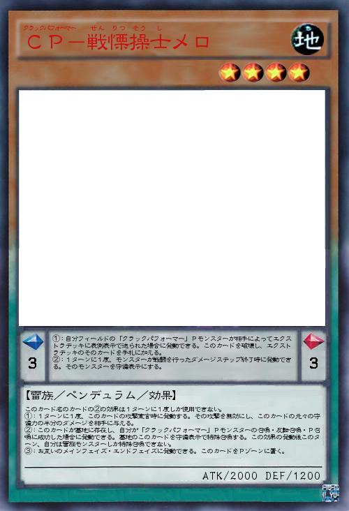 | このカード名のカードの②の効果は1ターンに1度しか使用できない。 ①:1ターンに1度、このカードの攻撃宣言時に発動する。その攻撃を無効にし、このカードの元々の守備力の半分のダメージを相手に与える。 ②:このカードが墓地に存在し、自分が「クラックパフォーマー」Pモンスターの召喚・反転召喚・P召喚に成功した場合に発動できる。墓地のこのカードを守備表示で特殊召喚する。この効果の発動後このターン、自分は雷族モンスターしか特殊召喚できない。 ③:お互いのメインフェイズ・エンドフェイズに発動できる。このカードをPゾーンに置く。 | |||