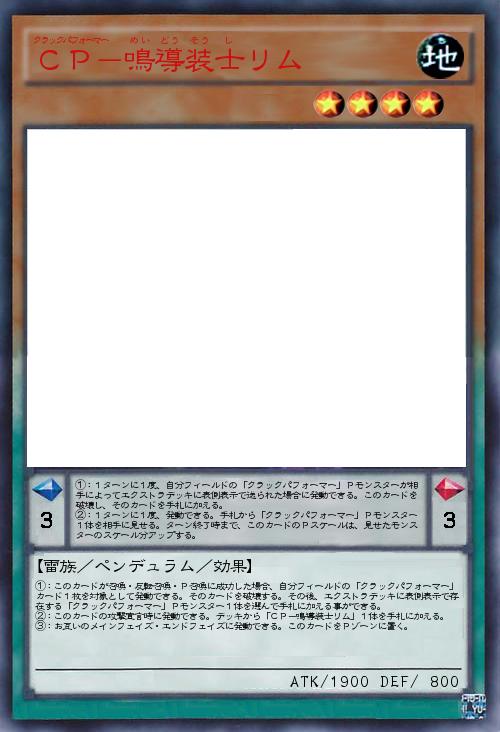 | ①:このカードが召喚・反転召喚・P召喚に成功した場合、自分フィールドの「クラックパフォーマー」カード1枚を対象として発動できる。そのカードを破壊する。その後、エクストラデッキに表側表示で存在する「クラックパフォーマー」Pモンスター1体を選んで手札に加える事ができる。 ②:このカードの攻撃宣言時に発動できる。デッキから「CP-鳴導装士リム」1体を手札に加える。 ③:お互いのメインフェイズ・エンドフェイズに発動できる。このカードをPゾーンに置く。 | |||