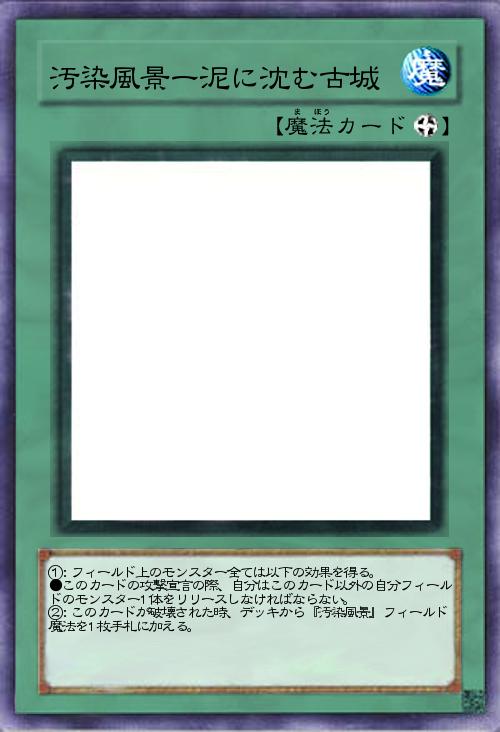 | ①:フィールド上のモンスター全ては以下の効果を得る。 ●このカードの攻撃宣言の際、自分はこのカード以外の自分フィールドのモンスター1体をリリースしなければならない。 ②:このカードが破壊された時、デッキから『汚染風景』フィールド魔法を1枚手札に加える。 | |||