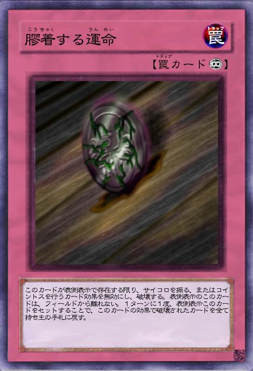 | このカードが表側表示で存在する限り、サイコロを振る、またはコイントスを行うカード効果を無効にし、破壊する。表側表示のこのカードは、フィールドから離れない。1ターンに1度、表側表示このカードをセットすることで、このカードの効果で破壊されたカードを全て持ち主の手札に戻す。 | |||
