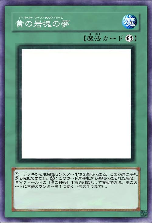 | ①:デッキから地属性モンスター1体を墓地へ送る。この効果は手札から発動できない。②:このカードが手札から墓地へ送られた場合、自分フィールドの「星の神殿」1枚を対象として発動できる。そのカードに金夢カウンターを1つ置く(最大1つまで)。 | |||