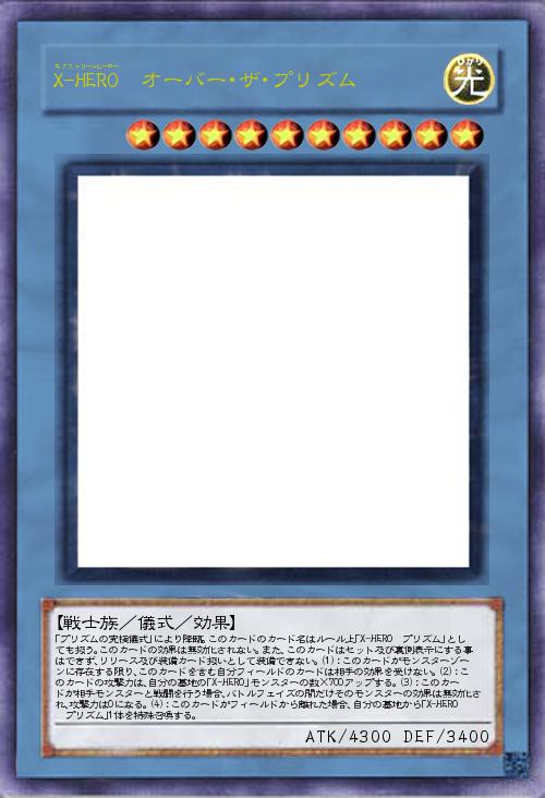 | 「プリズムの究極儀式」により降臨。このカードのカード名はルール上「X-HERO プリズム」としても扱う。このカードの効果は無効化されない。また、このカードはセット及び裏側表示にする事はできず、リリース及び装備カード扱いとして装備できない。(1):このカードがモンスターゾーンに存在する限り、このカードを含む自分フィールドのカードは相手の効果を受けない。(2):このカードの攻撃力は、自分の墓地の「X-HERO」モンスターの数×700アップする。(3):このカードが相手モンスターと戦闘を行う場合、バトルフェイズの間だけそのモンスターの効果は無効化され、攻撃力は0になる。(4):このカードがフィールドから離れた場合、自分の墓地から「X-HERO プリズム」1体を特殊召喚する。 | |||