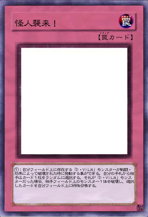 | ①:自分フィールド上に存在する「D・VILN」モンスターが戦闘・効果によって破壊された時に発動する事ができる。自分の手札から相手はカード1枚をランダムに選択する。それが「D・VILN」モンスターだった場合、相手フィールド上のモンスター1体を破壊し、選択したカードを自分フィールド上に特殊召喚する。 | |||