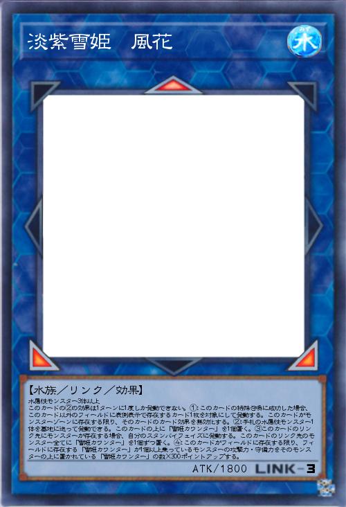 | 水属性モンスター3体以上 このカードの②の効果は1ターンに1度しか発動できない。①:このカードの特殊召喚に成功した場合、このカード以外のフィールドに表側表示で存在するカード1枚を対象にして発動する。このカードがモンスターゾーンに存在する限り、そのカードのカード効果を無効化する。②:手札の水属性モンスター1体を墓地に送って発動できる。このカードの上に「雪姫カウンター」を1個置く。③このカードのリンク先にモンスターが存在する場合、自分のスタンバイフェイズに発動する。このカードのリンク先のモンスター全てに「雪姫カウンター」を1個ずつ置く。④:このカードがフィールドに存在する限り、フィールドに存在する「雪姫カウンター」が1個以上乗っているモンスターの攻撃力・守備力をそのモンスターの上に置かれている「雪姫カウンター」の数×300ポイントアップする。 | |||