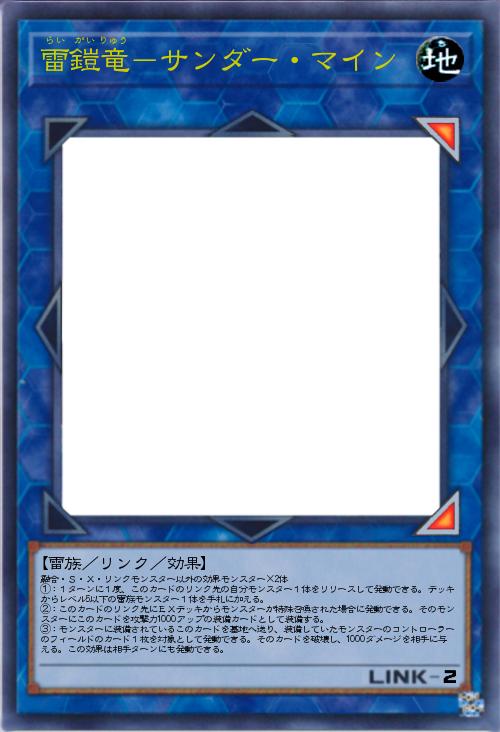 | 融合・S・X・リンクモンスター以外の効果モンスター×2体 ①:1ターンに1度、このカードのリンク先の自分モンスター1体をリリースして発動できる。デッキからレベル5以下の雷族モンスター1体を手札に加える。 ②:このカードのリンク先にEXデッキからモンスターが特殊召喚された場合に発動できる。そのモンスターにこのカードを攻撃力1000アップの装備カードとして装備する。 ③:モンスターに装備されているこのカードを墓地へ送り、装備していたモンスターのコントローラーのフィールドのカード1枚を対象として発動できる。そのカードを破壊し、1000ダメージを相手に与える。この効果は相手ターンにも発動できる。 | |||
