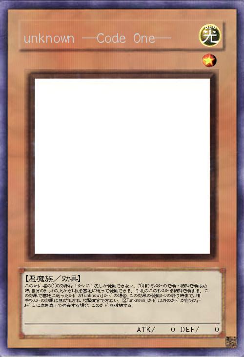 | このカ-ド名の①の効果は1タ-ンに1度しか発動できない.①相手モンスタ-の召喚・特殊召喚成功時,自分のデッキの上から1枚を墓地に送って発動できる.手札のこのモンスタ-を特殊召喚する.この効果で墓地に送ったカ-ドが「unknown」カ-ドの場合,この効果の発動タ-ンの終了時まで,相手モンスタ-の効果は無効化され,攻撃宣言できない.②「unknown」カ-ド以外のカ-ドが自分フィ-ルド上に表側表示で存在する場合,このカ-ドを破壊する. | |||