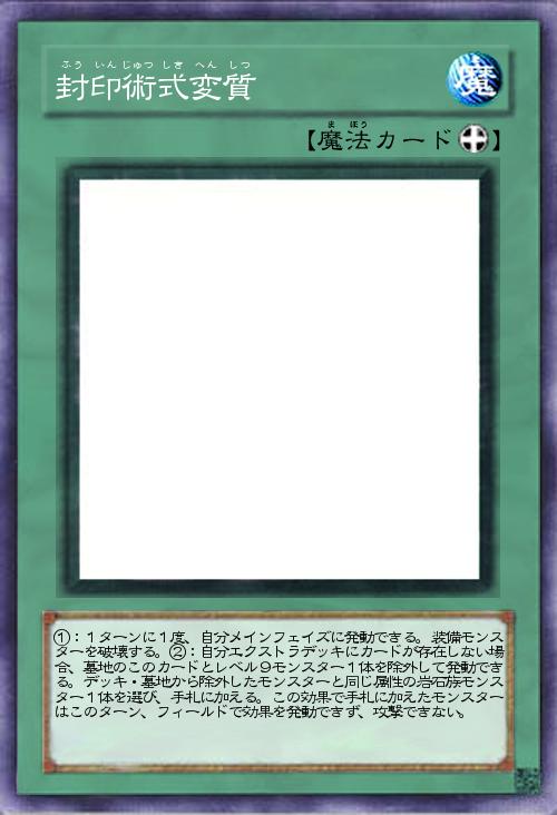 | ①:1ターンに1度、自分メインフェイズに発動できる。装備モンスターを破壊する。②:自分エクストラデッキにカードが存在しない場合、墓地のこのカードとレベル9モンスター1体を除外して発動できる。デッキ・墓地から除外したモンスターと同じ属性の岩石族モンスター1体を選び、手札に加える。この効果で手札に加えたモンスターはこのターン、フィールドで効果を発動できず、攻撃できない。 | |||