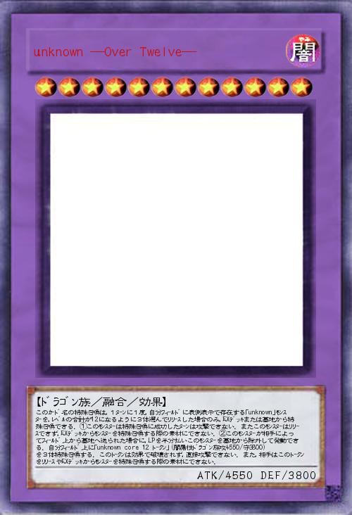 | このカ-ド名の特殊召喚は,1タ-ンに1度,自分フィ-ルドに表側表示で存在する「unknown」モンスタ-を,レベルの合計が12になるように3体選んでリリ-スした場合のみ,EXデッキまたは墓地から特殊召喚できる.①このモンスタ-は特殊召喚に成功したタ-ンは攻撃できない.またこのモンスタ-はリリ-スできず,EXデッキからモンスタ-を特殊召喚する際の素材にできない.②このモンスタ-が相手によってフィ-ルド上から墓地へ送られた場合に,LPを半分払いこのモンスタ-を墓地から除外して発動できる.自分フィ-ルド上に「unknown core 12 ト-クン」(闇属性ドラゴン族攻4550/守3800)を3体特殊召喚する.このト-クンは効果で破壊されず,直接攻撃できない.また,相手はこのト-クンをリリ-スやEXデッキからモンスタ-を特殊召喚する際の素材にできない. | |||