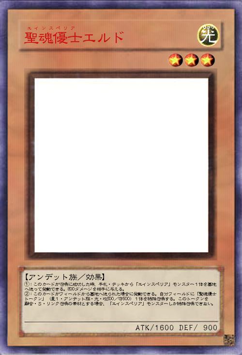 | ①:このカードが召喚に成功した時、手札・デッキから「エインスペリア」モンスター1体を墓地へ送って発動できる。800ダメージを相手に与える。 ②:このカードがフィールドから墓地へ送られた場合に発動できる。自分フィールドに「聖魂優士トークン」(星1・アンデット族・光・攻500/守500)1体を特殊召喚する。このトークンを融合・S・リンク召喚の素材とする場合、「エインスペリア」モンスターしか特殊召喚できない。 | |||