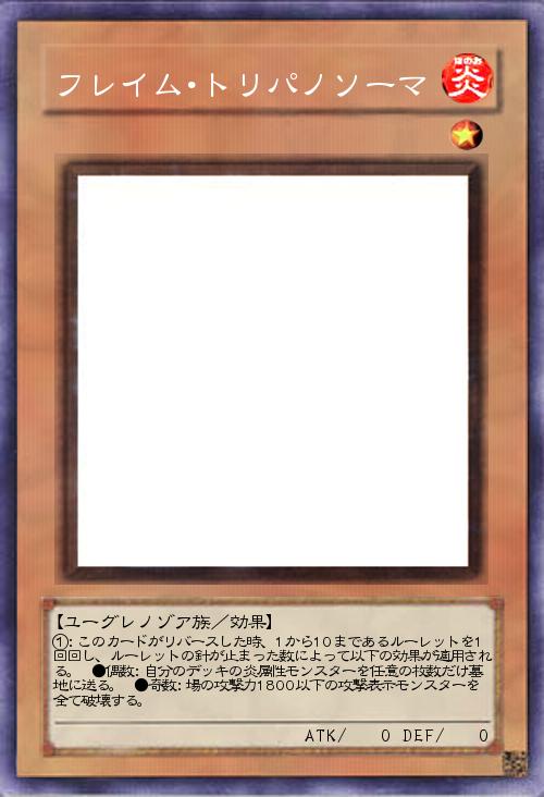 | ①:このカードがリバースした時、1から10まであるルーレットを1回回し、ルーレットの針が止まった数によって以下の効果が適用される。 ●偶数:自分のデッキの炎属性モンスターを任意の枚数だけ墓地に送る。 ●奇数:場の攻撃力1800以下の攻撃表示モンスターを全て破壊する。 | |||