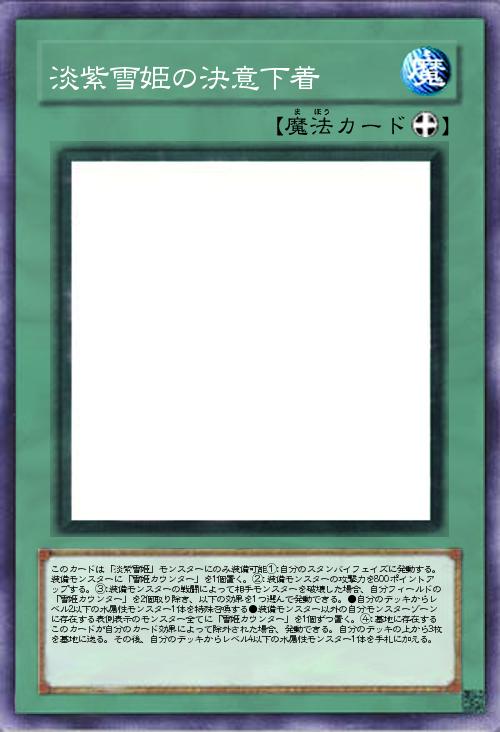 | このカードは「淡紫雪姫」モンスターにのみ装備可能①:自分のスタンバイフェイズに発動する。装備モンスターに「雪姫カウンター」を1個置く。②:装備モンスターの攻撃力を800ポイントアップする。③:装備モンスターの戦闘によって相手モンスターを破壊した場合、自分フィールドの「雪姫カウンター」を2個取り除き、以下の効果を1つ選んで発動できる。●自分のデッキからレベル2以下の水属性モンスター1体を特殊召喚する●装備モンスター以外の自分モンスターゾーンに存在する表側表示のモンスター全てに「雪姫カウンター」を1個ずつ置く。④:墓地に存在するこのカードが自分のカード効果によって除外された場合、発動できる。自分のデッキの上から3枚を墓地に送る。その後、自分のデッキからレベル4以下の水属性モンスター1体を手札に加える。 | |||