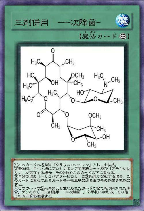 | ①このカードの名前は「クラリスロマイシン」としても扱う。 ②発動時、手札・場にプロトンポンプ阻害族カード及び「アモキシシリン」が存在する場合、その2枚をこのカードの下に重ねる。 ③自分の場の「ヘリコバクターピロリ」の③効果が発動する場合、このカードに重ねてあるカードを一枚墓地に送る事でその効果を無効にする。 ④このカードの③効果により重ねられたカードが全て取り除かれた場合、デッキから「三剤併用 -二次除菌-」を手札に加える。その後このカードを破壊する。 | |||