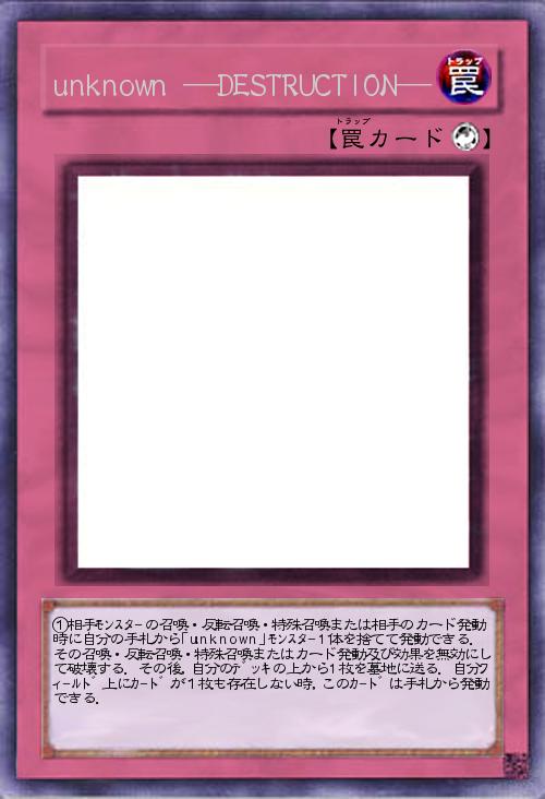 | ①相手モンスタ-の召喚・反転召喚・特殊召喚または相手のカード発動時に自分の手札から「unknown」モンスタ-1体を捨てて発動できる.その召喚・反転召喚・特殊召喚またはカード発動及び効果を無効にして破壊する.その後,自分のデッキの上から1枚を墓地に送る.自分フィ-ルド上にカ-ドが1枚も存在しない時,このカ-ドは手札から発動できる. | |||