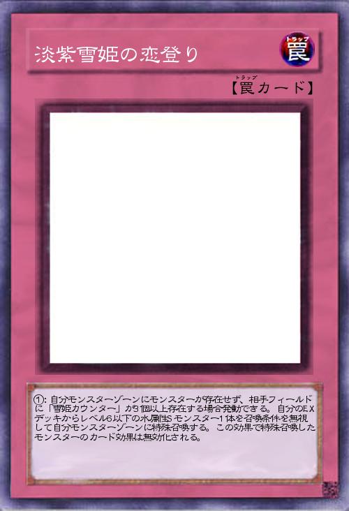 | ①:自分モンスターゾーンにモンスターが存在せず、相手フィールドに「雪姫カウンター」が3個以上存在する場合発動できる。自分のEXデッキからレベル6以下の水属性Sモンスター1体を召喚条件を無視して自分モンスターゾーンに特殊召喚する。この効果で特殊召喚したモンスターのカード効果は無効化される。 | |||