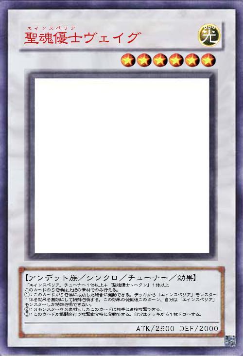 | 「エインスペリア」チューナー1体以上+「聖魂優士トークン」1体以上 このカードのS召喚は上記の素材でのみ行える。 ①:このカードがS召喚に成功した場合に発動できる。デッキから「エインスペリア」モンスター1体を効果を無効にして特殊召喚する。この効果の発動後このターン、自分は「エインスペリア」モンスターしか特殊召喚できない。 ②:SモンスターをS素材としたこのカードは相手に直接攻撃できる。 ③:このカードが戦闘を行う攻撃宣言時に発動できる。自分はデッキから1枚ドローする。 | |||