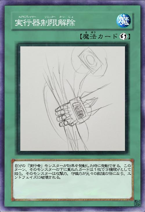 「今回は「実行器」に組み込まれた「リミッター」を解除するカード。各実行器に1枚はストックされており、いざという時はこれを使って無理やり必殺技を放つという保険のカード。やはり制限解除の宿命か、放った後は破壊される。