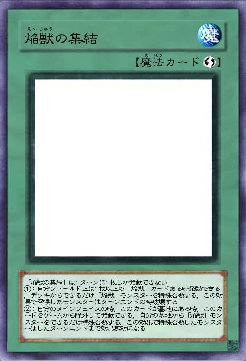 | 「焔獣の集結」は1ターンに1枚しか発動できない ①:自分フィールド上は1枚以上の「焔獣」カードある時発動できる,デッキからできるだけ「焔獣」モンスターを特殊召喚する,この効果で召喚したモンスターはターンエンドの時破壊する ②:自分のメインフェイスの時,このカードが墓地にある時,このカードをゲームから除外して発動できる,自分の墓地から「焔獣」モンスターをできるだけ特殊召喚する,この効果で特殊召喚したモンスターはしたターンエンドまで効果無効になる | |||