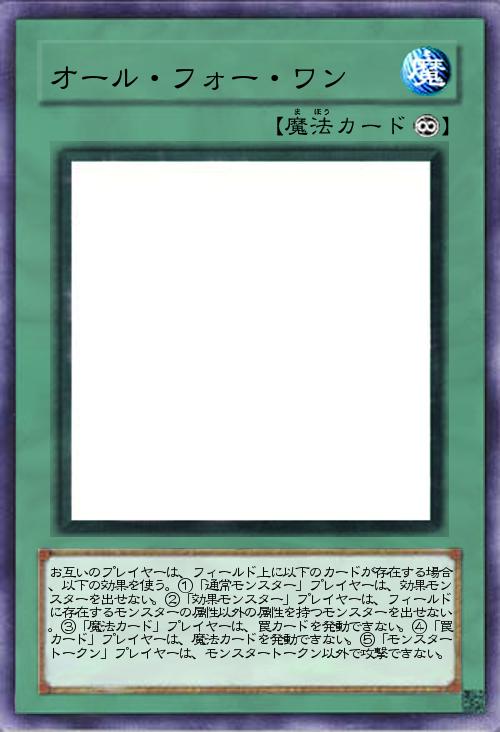 | お互いのプレイヤーは、フィールド上に以下のカードが存在する場合、以下の効果を使う。①「通常モンスター」プレイヤーは、効果モンスターを出せない。②「効果モンスター」プレイヤーは、フィールドに存在するモンスターの属性以外の属性を持つモンスターを出せない。③「魔法カード」プレイヤーは、罠カードを発動できない。④「罠カード」プレイヤーは、魔法カードを発動できない。⑤「モンスタートークン」プレイヤーは、モンスタートークン以外で攻撃できない。 | |||
