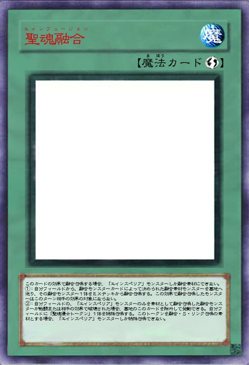 | このカードの効果で融合召喚する場合、「エインスペリア」モンスターしか融合素材にできない。 ①:自分フィールドから、融合モンスターカードによって決められた融合素材モンスターを墓地へ送り、その融合モンスター1体をEXデッキから融合召喚する。この効果で融合召喚したモンスターはこのターン相手の効果の対象にならない。 ②:自分フィールドの、「エインスペリア」モンスターのみを素材として融合召喚した融合モンスターが戦闘または相手の効果で破壊された場合、墓地のこのカードを除外して発動できる。自分フィールドに「聖魂優士トークン」1体を特殊召喚する。このトークンを融合・S・リンク召喚の素材とする場合、「エインスペリア」モンスターしか特殊召喚できない。 | |||