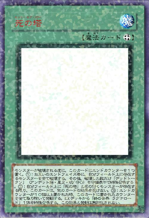 | モンスターが破壊される度に、このカードにエンドカウンターを1つ置く。①:お互いのエンドフェイズ毎に、自分フィールド上に存在するモンスターを全て破壊する。その後、破壊した数だけ「デッドトークン」(アンデット族・星2・功/守0)を守備表示で特殊召喚する。②:自分フィールド上に「死の塔」と名の付くモンスターが存在する限り、このカードは、他のカードの効果を受けない。③:エンドカウンターが10個以上置かれた時、このカードに置かれたカウンターを全て取り除いて発動する。EXデッキから「終の世界 ラグナロード」1体を特殊召喚する。この効果と発動は無効化されない。 | |||