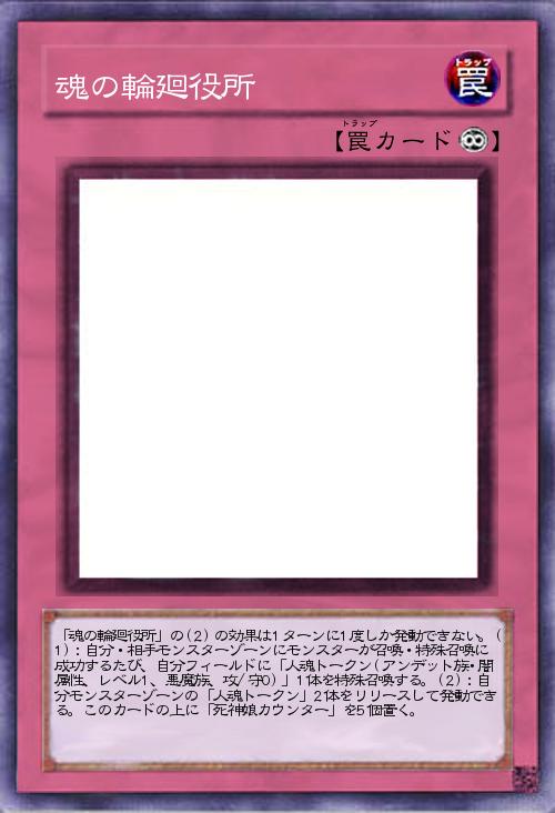 | 「魂の輪廻役所」の(2)の効果は1ターンに1度しか発動できない。(1):自分・相手モンスターゾーンにモンスターが召喚・特殊召喚に成功するたび、自分フィールドに「人魂トークン(アンデット族・闇属性、レベル1、悪魔族、攻/守0)」1体を特殊召喚する。(2):自分モンスターゾーンの「人魂トークン」2体をリリースして発動できる。このカードの上に「死神娘カウンター」を5個置く。 | |||