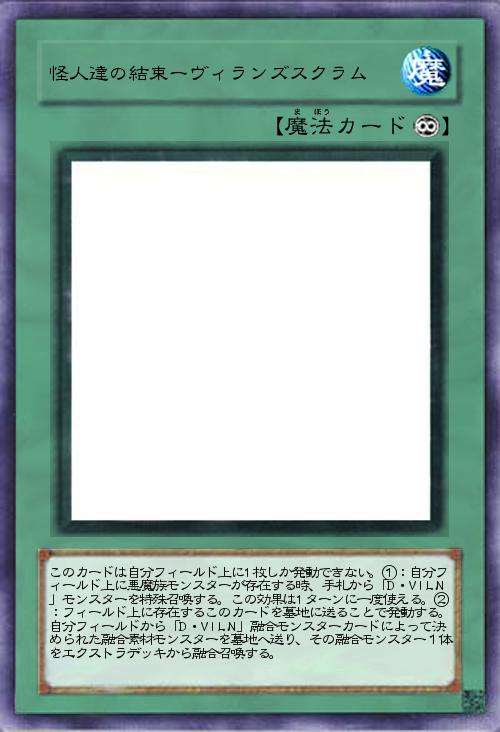 | このカードは自分フィールド上に1枚しか発動できない。①:自分フィールド上に悪魔族モンスターが存在する時、手札から「D・VILN」モンスターを特殊召喚する。この効果は1ターンに一度使える。②:フィールド上に存在するこのカードを墓地に送ることで発動する。自分フィールドから「D・VILN」融合モンスターカードによって決められた融合素材モンスターを墓地へ送り、その融合モンスター1体をエクストラデッキから融合召喚する。 | |||