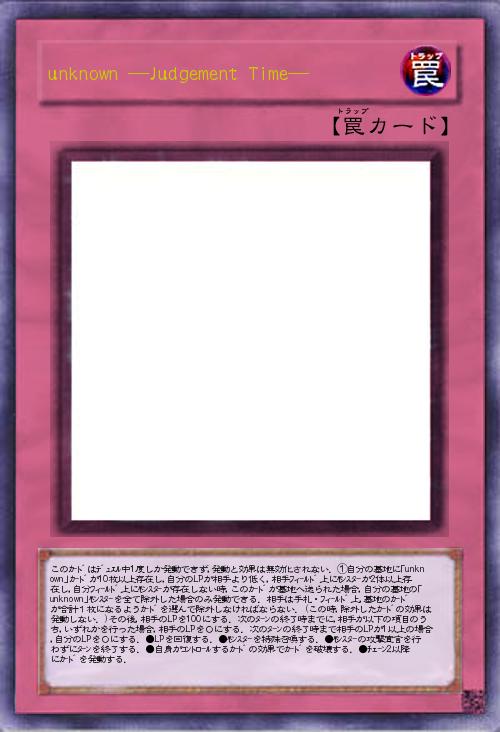 | このカ-ドはデュエル中1度しか発動できず,発動と効果は無効化されない.①自分の墓地に「unknown」カ-ドが10枚以上存在し,自分のLPが相手より低く,相手フィ-ルド上にモンスタ-が2体以上存在し,自分フィ-ルド上にモンスタ-が存在しない時,このカ-ドが墓地へ送られた場合,自分の墓地の「unknown」モンスタ-を全て除外した場合のみ発動できる.相手は手札・フィ-ルド上,墓地のカ-ドが合計1枚になるようカ-ドを選んで除外しなければならない.(この時,除外したカ-ドの効果は発動しない.)その後,相手のLPを100にする.次のタ-ンの終了時までに,相手が以下の項目のうち,いずれかを行った場合,相手のLPを0にする.次のタ-ンの終了時まで相手のLPが1以上の場合,自分のLPを0にする.●LPを回復する.●モンスタ-を特殊召喚する.●モンスタ-の攻撃宣言を行わずにタ-ンを終了 | |||