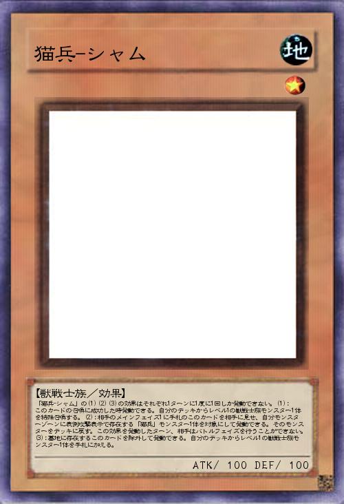 | 「猫兵-シャム」の(1)(2)(3)の効果はそれぞれ1ターンに1度に1回しか発動できない。(1):このカードの召喚に成功した時発動できる。自分のデッキからレベル1の獣戦士族モンスター1体を特殊召喚する。(2):相手のメインフェイズ1に手札のこのカードを相手に見せ、自分モンスターゾーンに表側攻撃表示で存在する「猫兵」モンスター1体を対象にして発動できる。そのモンスターをデッキに戻す。この効果を発動したターン、相手はバトルフェイズを行うことができない。(3):墓地に存在するこのカードを除外して発動できる。自分のデッキからレベル1の獣戦士族モンスター1体を手札に加える。 | |||