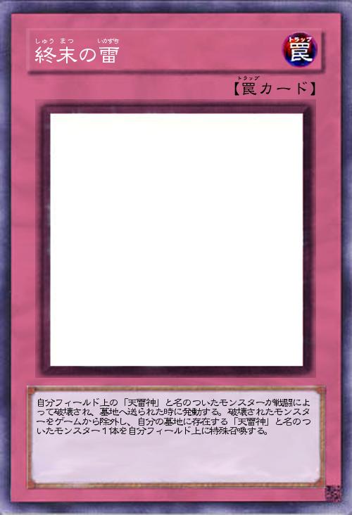 | 自分フィールド上の「天雷神」と名のついたモンスターが戦闘によって破壊され、墓地へ送られた時に発動する。破壊されたモンスターをゲームから除外し、自分の墓地に存在する「天雷神」と名のついたモンスター1体を自分フィールド上に特殊召喚する。 | |||