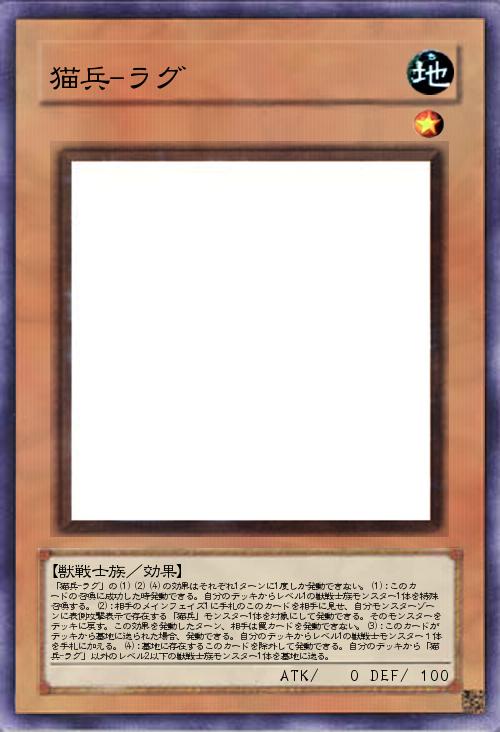 | 「猫兵-ラグ」の(1)(2)(4)の効果はそれぞれ1ターンに1度しか発動できない。(1):このカードの召喚に成功した時発動できる。自分のデッキからレベル1の獣戦士族モンスター1体を特殊召喚する。(2):相手のメインフェイズ1に手札のこのカードを相手に見せ、自分モンスターゾーンに表側攻撃表示で存在する「猫兵」モンスター1体を対象にして発動できる。そのモンスターをデッキに戻す。この効果を発動したターン、相手は罠カードを発動できない。(3):このカードがデッキから墓地に送られた場合、発動できる。自分のデッキからレベル1の獣戦士モンスター1体を手札に加える。(4):墓地に存在するこのカードを除外して発動できる。自分のデッキから「猫兵-ラグ」以外のレベル2以下の獣戦士族モンスター1体を墓地に送る。 | |||