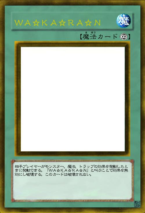 | 相手プレイヤーがモンスター、魔法、トラップの効果を発動したときに発動できる。「WA☆KA☆RA☆N」と叫ぶことで効果を無効にし破壊する。このカードは破壊されない。 | |||
