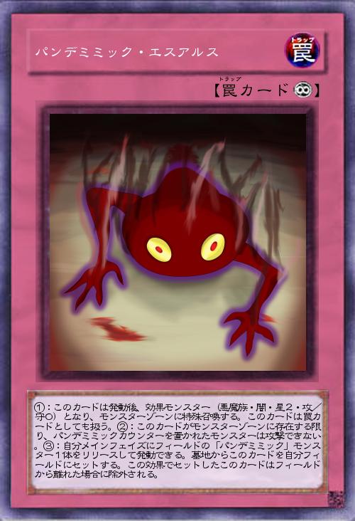 | ①:このカードは発動後、効果モンスター(悪魔族・闇・星2・攻/守0)となり、モンスターゾーンに特殊召喚する。このカードは罠カードとしても扱う。②:このカードがモンスターゾーンに存在する限り、パンデミミックカウンターを置かれたモンスターは攻撃できない。③:自分メインフェイズにフィールドの「パンデミミック」モンスター1体をリリースして発動できる。墓地からこのカードを自分フィールドにセットする。この効果でセットしたこのカードはフィールドから離れた場合に除外される。 | |||