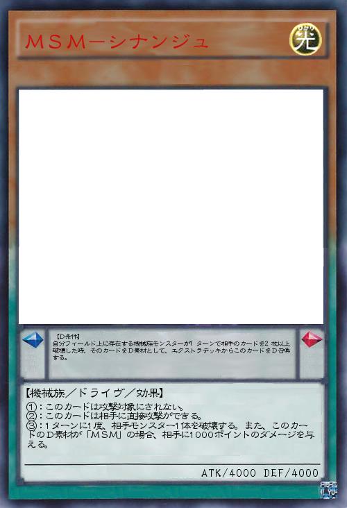 | ①:このカードは攻撃対象にされない。 ②:このカードは相手に直接攻撃ができる。 ③:1ターンに1度、相手モンスター1体を破壊する。また、このカードのD素材が「MSM」の場合、相手に1000ポイントのダメージを与える。 | |||