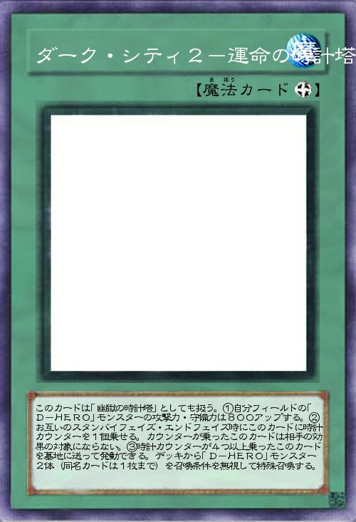 | このカードは「幽獄の時計塔」としても扱う。①自分フィールドの「D-HERO」モンスターの攻撃力・守備力は800アップする。②お互いのスタンバイフェイズ・エンドフェイズ時にこのカードに時計カウンターを1個乗せる。カウンターが乗ったこのカードは相手の効果の対象にならない。③時計カウンターが4つ以上乗ったこのカードを墓地に送って発動できる。デッキから「D-HERO」モンスター2体(同名カードは1枚まで)を召喚条件を無視して特殊召喚する。 | |||