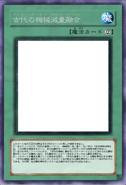 古代の機械は最近融合モンスターも融合のサポートも増えましたし、こんなちょっと変わった専用融合カードがあっても面白そうだなと思って、こんなカードを考えてみました。」(2017-11-26 10:46)