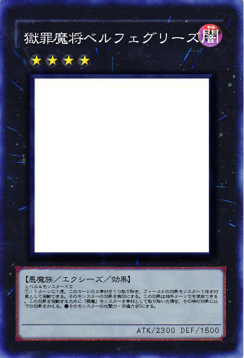| レベル4モンスター×2 ①:1ターンに1度、このカードのX素材を1つ取り除き、フィールドの効果モンスター1体を対象として発動できる。そのモンスターの効果を無効にする。この効果は相手ターンでも使用できる。この効果を発動するために「罪魔」モンスターを素材として取り除いた場合、その時の効果に以下の効果を加える。●そのモンスターの攻撃力・守備力を0にする。 | |||