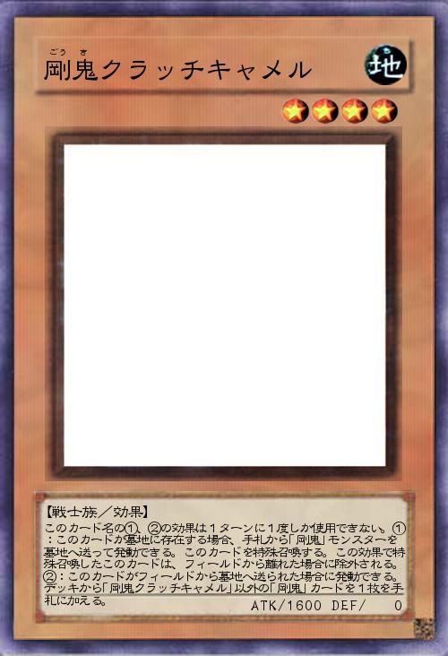 | このカード名の①、②の効果は1ターンに1度しか使用できない。①:このカードが墓地に存在する場合、手札から「剛鬼」モンスターを墓地へ送って発動できる。このカードを特殊召喚する。この効果で特殊召喚したこのカードは、フィールドから離れた場合に除外される。②:このカードがフィールドから墓地へ送られた場合に発動できる。デッキから「剛鬼クラッチキャメル」以外の「剛鬼」カードを1枚を手札に加える。 | |||