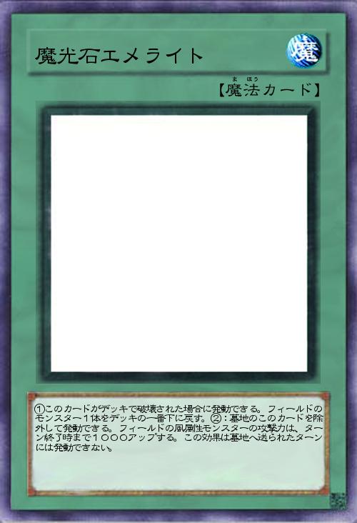 | ①このカードがデッキで破壊された場合に発動できる。フィールドのモンスター1体をデッキの一番下に戻す。②:墓地のこのカードを除外して発動できる。フィールドの風属性モンスターの攻撃力は、ターン終了時まで1000アップする。この効果は墓地へ送られたターンには発動できない。 | |||