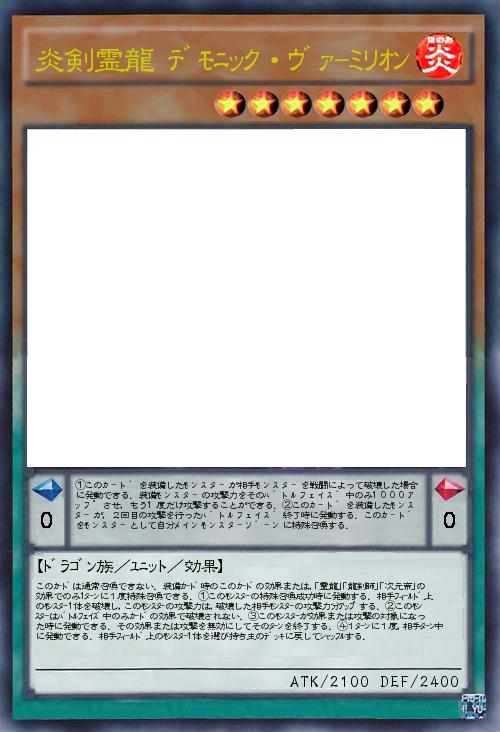| このカ-ドは通常召喚できない.装備カ-ド時のこのカ-ドの効果または,「霊龍」「龍剣師」「次元帝」の効果でのみ1タ-ンに1度特殊召喚できる.①このモンスタ-の特殊召喚成功時に発動する.相手フィ-ルド上のモンスタ-1体を破壊し,このモンスタ-の攻撃力は,破壊した相手モンスタ-の攻撃力分アップする.②このモンスタ-はバトルフェイズ中のみカ-ドの効果で破壊されない.③このモンスタ-が効果または攻撃の対象になった時に発動できる.その効果または攻撃を無効にしてそのタ-ンを終了する.④1タ-ンに1度,相手タ-ン中に発動できる.相手フィ-ルド上のモンスタ-1体を選び持ち主のデッキに戻してシャッフルする. | |||