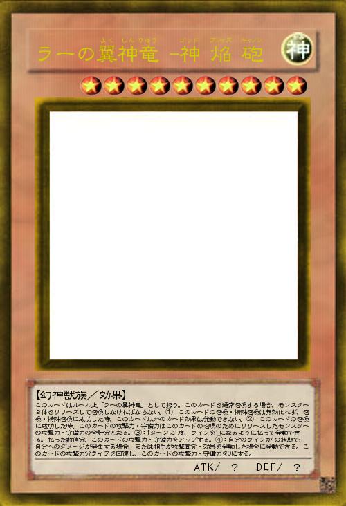 | このカードはルール上「ラーの翼神竜」として扱う。このカードを通常召喚する場合、モンスター3体をリリースして召喚しなければならない。①:このカードの召喚・特殊召喚は無効化れず、召喚・特殊召喚に成功した時、このカード以外のカード効果は発動できない。②:このカードの召喚に成功した時、このカードの攻撃力・守備力はこのカードの召喚のためにリリースしたモンスターの攻撃力・守備力の合計分となる。③:1ターンに1度、ライフを1になるように払って発動できる。払った数値分、このカードの攻撃力・守備力をアップする。④:自分のライフが1の状態で、自分へのダメージが発生する場合、または相手が攻撃宣言・効果を発動した場合に発動できる。このカードの攻撃力分ライフを回復し、このカードの攻撃力・守備力を0にする。 | |||