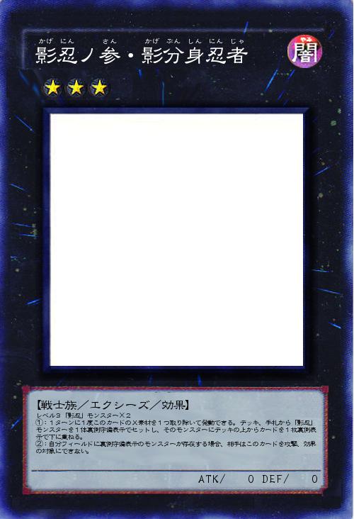 | レベル3「影忍」モンスター×2 ①:1ターンに1度このカードのX素材を1つ取り除いて発動できる。デッキ、手札から「影忍」モンスターを1体裏側守備表示でセットし、そのモンスターにデッキの上からカードを1枚裏側表示で下に重ねる。 ②:自分フィールドに裏側守備表示のモンスターが存在する場合、相手はこのカードを攻撃、効果の対象にできない。 | |||