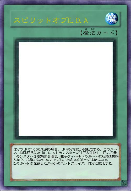 | 自分のLPが1000未満の場合、LP半分を払い発動できる。このターン、特殊召喚した「E.D.A」モンスターが「巨大生物」「巨大兵器」モンスターを攻撃する場合、相手フィールドのカードの効果は無効となり、攻撃力は2000アップし、与えるダメージは倍になる。 このカードの発動したターンのエンドフェイズ、自分は敗北する。 | |||