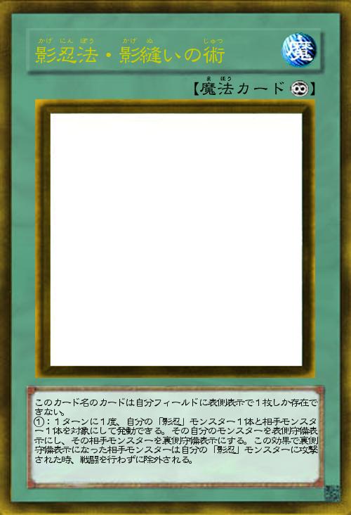 | このカード名のカードは自分フィールドに表側表示で1枚しか存在できない。 ①:1ターンに1度、自分の「影忍」モンスター1体と相手モンスター1体を対象にして発動できる。その自分のモンスターを表側守備表示にし、その相手モンスターを裏側守備表示にする。この効果で裏側守備表示になった相手モンスターは自分の「影忍」モンスターに攻撃された時、戦闘を行わずに除外される。 | |||