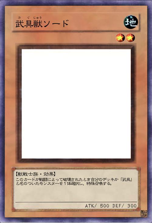 | このカードが戦闘によって破壊されたとき自分のデッキか「武具」と名のついたモンスターを1体選択し、特殊召喚する。 | |||