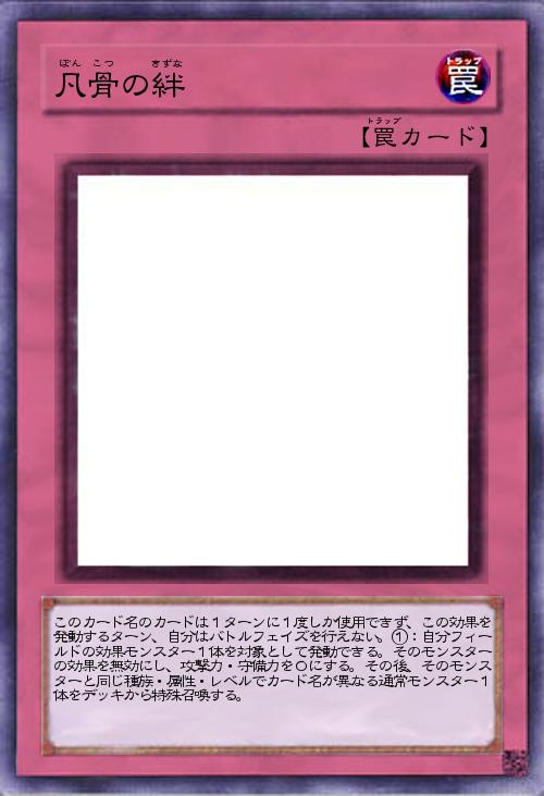 | このカード名のカードは1ターンに1度しか使用できず、この効果を発動するターン、自分はバトルフェイズを行えない。①:自分フィールドの効果モンスター1体を対象として発動できる。そのモンスターの効果を無効にし、攻撃力・守備力を0にする。その後、そのモンスターと同じ種族・属性・レベルでカード名が異なる通常モンスター1体をデッキから特殊召喚する。 | |||