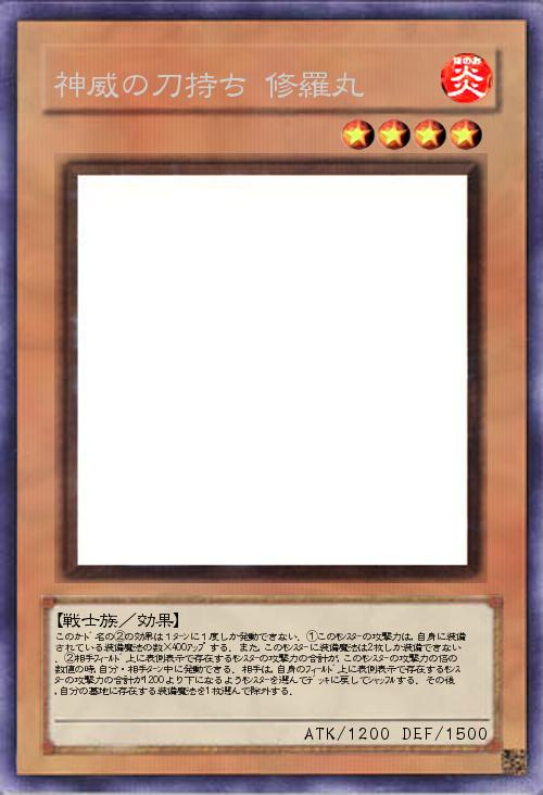 | このカ-ド名の②の効果は1タ-ンに1度しか発動できない.①このモンスタ-の攻撃力は,自身に装備されている装備魔法の数×400アップする.また,このモンスタ-に装備魔法は2枚しか装備できない.②相手フィ-ルド上に表側表示で存在するモンスタ-の攻撃力の合計が,このモンスタ-の攻撃力の倍の数値の時,自分・相手タ-ン中に発動できる.相手は,自身のフィ-ルド上に表側表示で存在するモンスタ-の攻撃力の合計が1200より下になるようモンスタ-を選んでデッキに戻してシャッフルする.その後,自分の墓地に存在する装備魔法を1枚選んで除外する. | |||