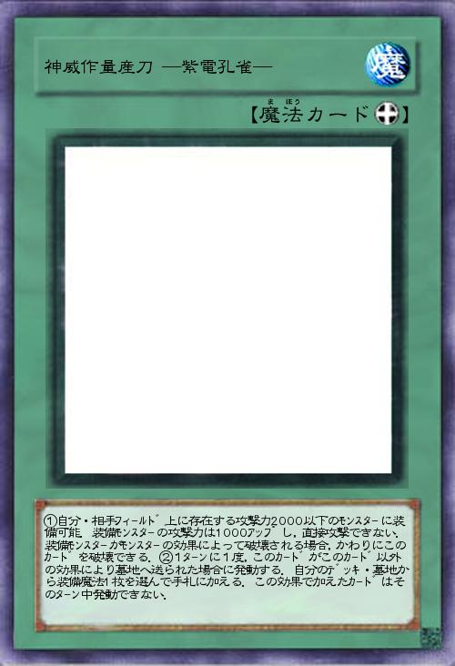 | ①自分・相手フィ-ルド上に存在する攻撃力2000以下のモンスタ-に装備可能.装備モンスタ-の攻撃力は1000アップし,直接攻撃できない.装備モンスタ-がモンスタ-の効果によって破壊される場合,かわりにこのカ-ドを破壊できる.②1タ-ンに1度,このカ-ドがこのカ-ド以外の効果により墓地へ送られた場合に発動する.自分のデッキ・墓地から装備魔法1枚を選んで手札に加える.この効果で加えたカ-ドはそのタ-ン中発動できない. | |||