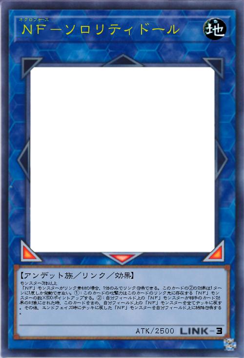 | モンスター3体以上 「NF」モンスターがリンク素材の場合、1体のみでリンク召喚できる。このカードの②の効果は1ターンに1度しか発動できない。①:このカードの攻撃力はこのカードのリンク先に存在する「NF」モンスターの数×500ポイントアップする。②:自分フィールド上の「NF」モンスターが相手のカード効果の対象にされた時、このカードを含め、自分フィールド上の「NF」モンスターを全てデッキに戻す。その後、エンドフェイズ時にデッキに戻した「NF」モンスターを自分フィールド上に特殊召喚する。 | |||